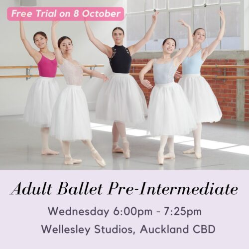 The class level is set for dancers who have some previous ballet/dance experience and is equivalent to RAD grade 4-6/ Cecchetti grade 4-5. Starting with basic barre exercises, you’ll enjoy port de bras/adage with beautiful music in centre and start learning single pirouettes, posé turns, and some jumps including temps levés and batteries such as entrechat quatre. This class has a great sense of team and enjoys rehearsing and performing a group dance every year.