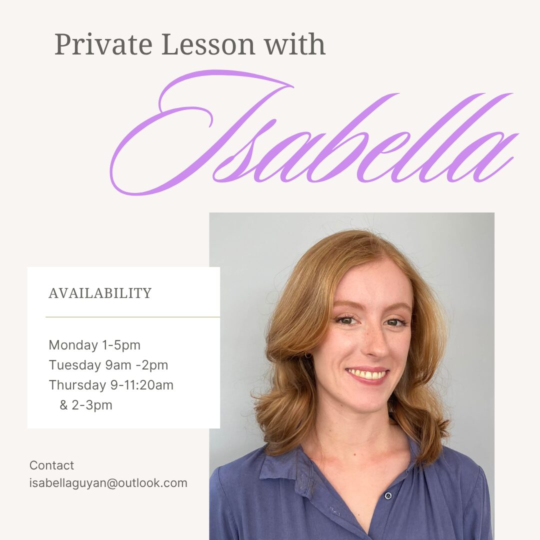 To book a lesson or inquire details, please contact Isabella via email at isabellaguyan@outlook.com
